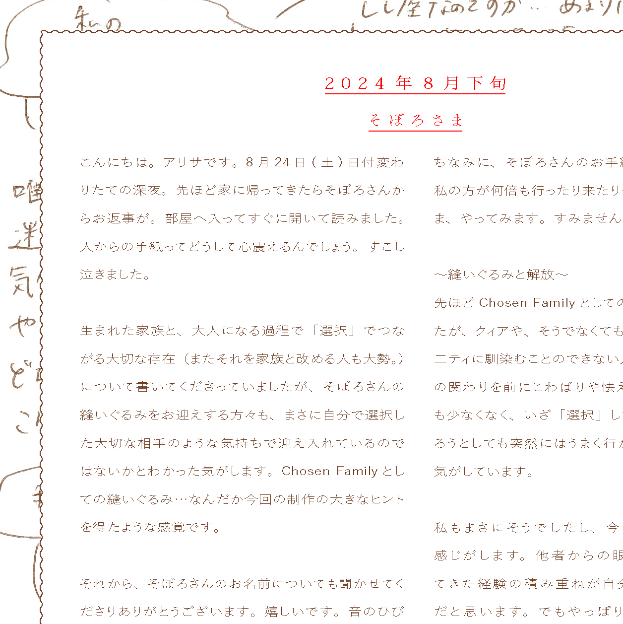 欠けたまま自由になるための縫いぐるみづくり -そぼろとアリサのささやかなお手紙記録-