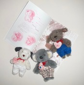 オリジナルタイトルシールで閉じた特別パッケージに、縫いぐるみ誕生の記念写真をフルカラーステッカーにしたものと、縫いぐるみたちが首元につけているチャームをみなさんにも作っていただける「なめらかなハートのつくりかた」チラシを付録として同封しお届けします。